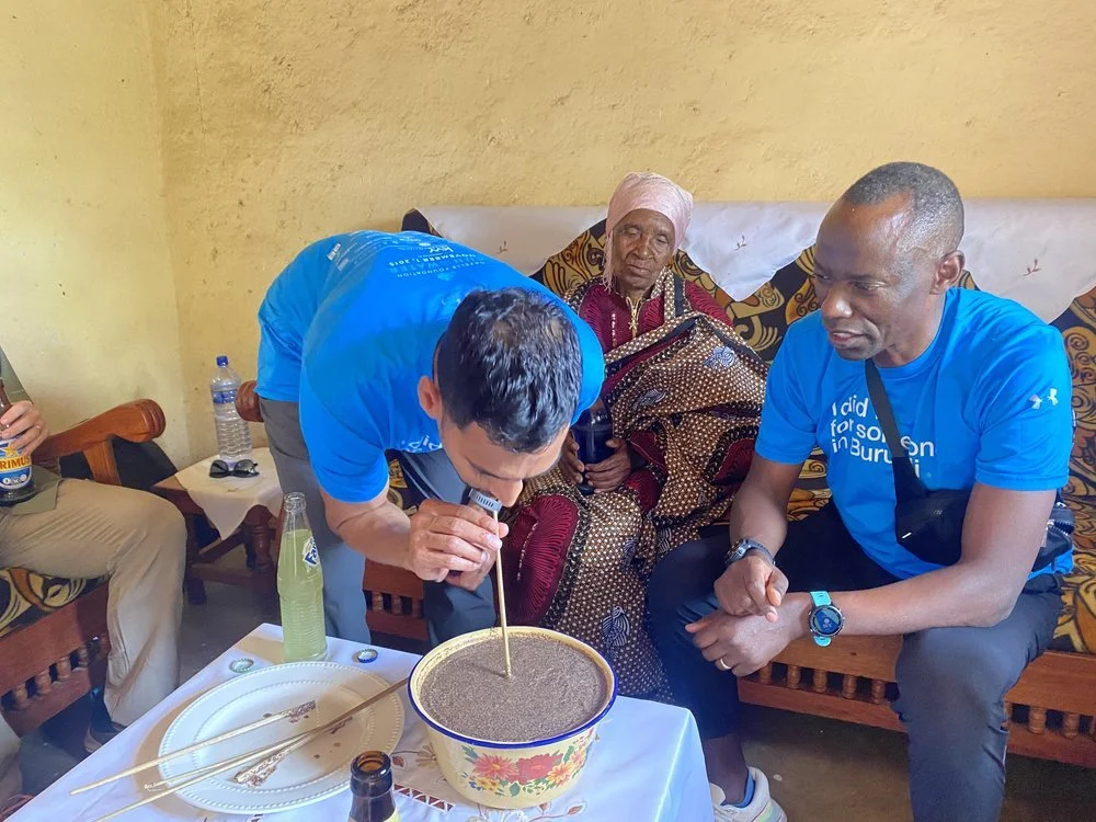 Ashish samples an authentic Burundian dish at Gilbert’s home in Burundi with his mom back in 2023.